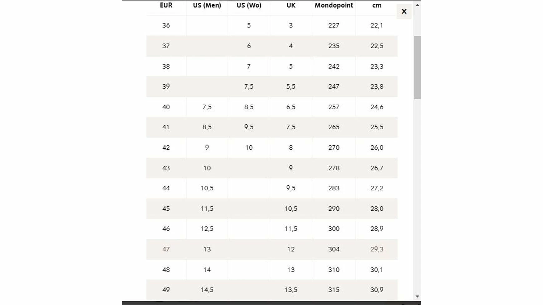 | Größe | 40, 41, 42, 43, 44, 45, 46, 47, 48, 49, 50 |
