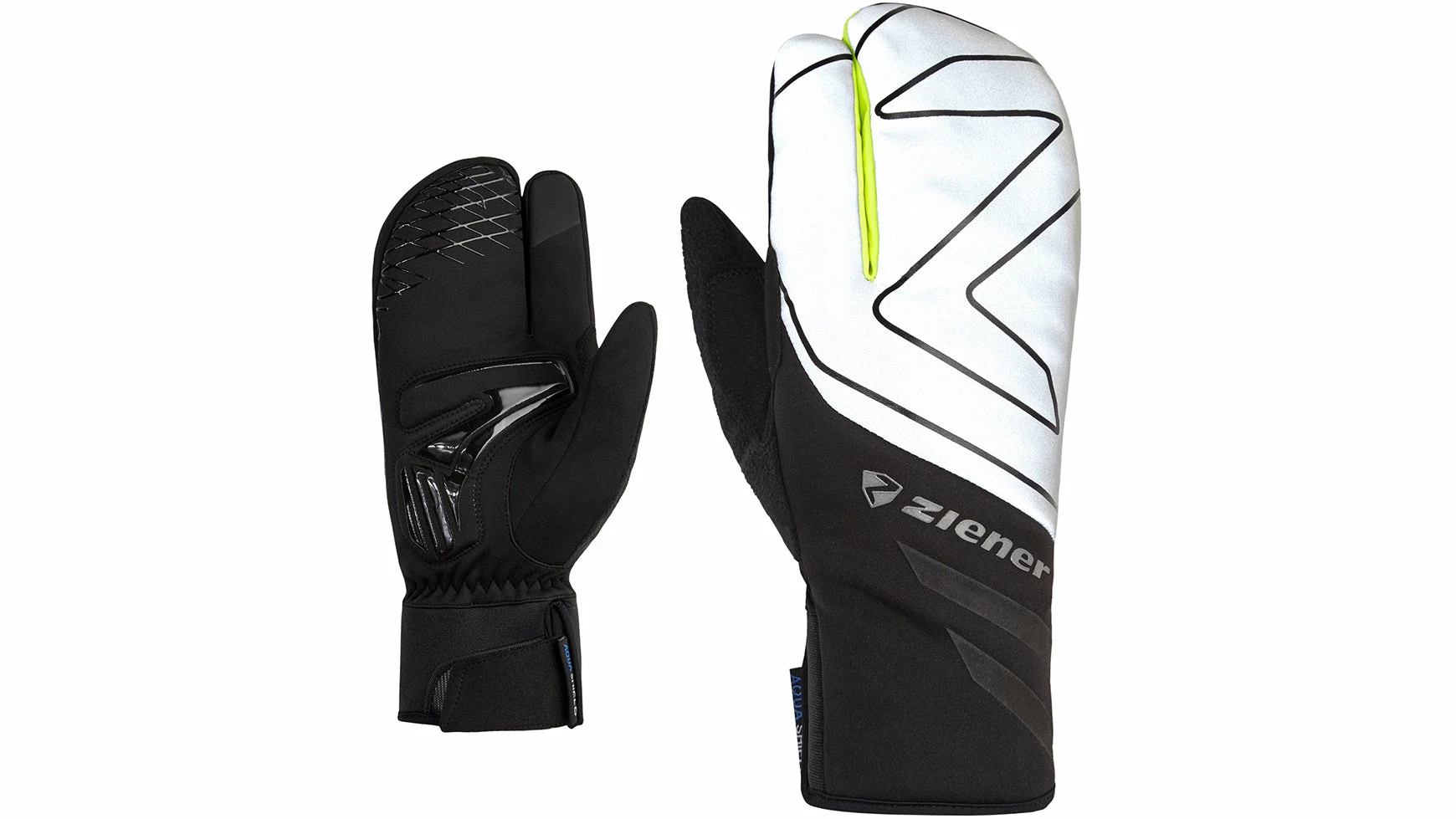 Der wasserdichte ZIENER Winter-Fahrradlobster DALYO AS TOUCH aus Softshell-Material garantiert perfektes Bikevergnügen in der kalten Jahreszeit. Die wasser- und winddichte ZIENER AQUASHIELD Membran hält auch bei widrigem Wetter angenehm trocken und warm. Hervorragendes Griffgefühl und Robustheit ist durch die leicht gepolsterte Innenhand gewährleistet. Bei besonders schweißtreibenden Aktivitäten kann man mit dem Fleece Daumen den Schweiß leicht abwischen. Mit der integrierten TOUCH Funktion können mit den Handschuhen mit Lobster Fingerteilung Touchscreens bedient werden. Das enganliegende Bündchen mit Klettverschluss sorgt für einen optimalen Abschluss am Handgelenk und eine gute Passform. Die Einfassung an der scharfen Klettkante schützt das Material und erhöht den Bedienungskomfort. Auf der Oberhand sind reflektierende Designelemente eingearbeitet.